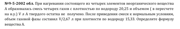 При нагревании состоящего из четырех элементов неорганического вещества А образовалась смесь четырех газов с плотностью по водороду 20,25 и объемом ( в пересчете на н.у. ) V л А твердого остатка не получено. После приведения смеси к нормальным условиям, объем газовой фазы составил V/2,67 л при плотности по водороду 15,33. Определите формулу вещества А.