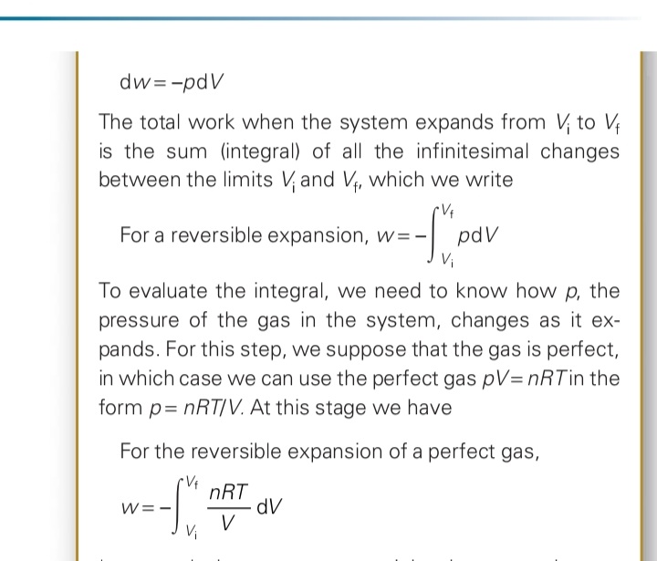 Ну вообще, по определению w = -p_{ex}dV (газ расширяется/сжимается против внешнего давления). Если расширение/сжатие обратимое, то в любой момент расширения/сжатия, p_{in} = p_{ex}. Допустим газ идеальный и температура постоянная, тогда \displaystyle p_{in} = \frac{nRT}{V}. В таком случае,