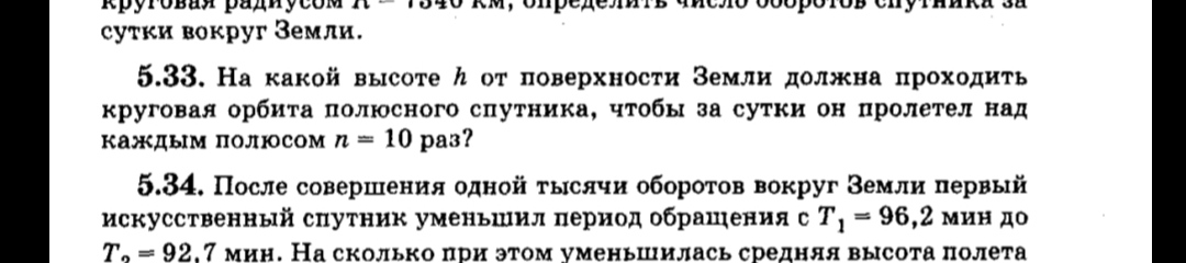 5.33. На какой высоте h от поверхности Земли должна проходить круговая орбита полюсного спутника, чтобы за сутки он пролетел над каждым полюсом n=10 раз?