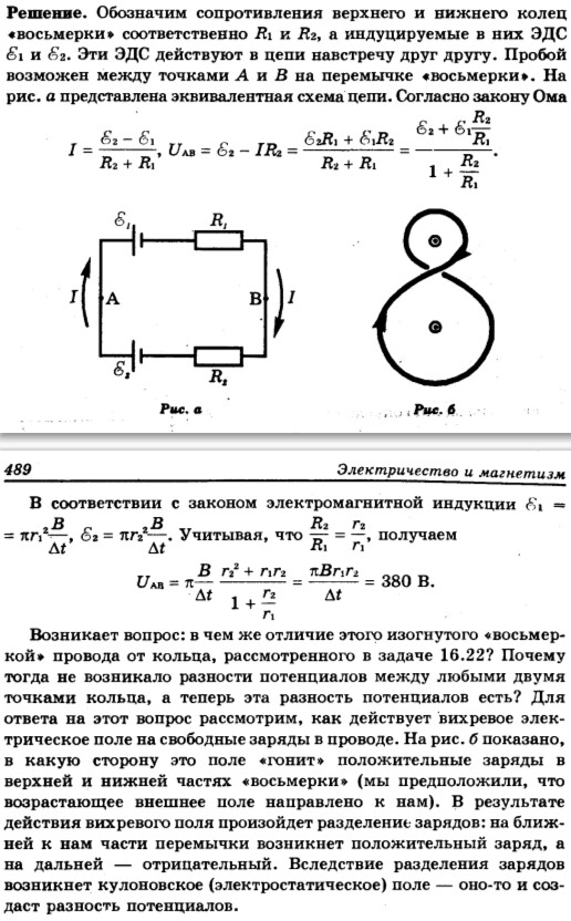 Виток провода изогнут в виде восьмерки (см. рисунок), так что r1 = 20 мм и r2 = 60 мм. В течение времени ∆t = 0,50 мс однородное магнитное поле, перпендикулярное плоскости витка, равномерно возрастает. Начальное значение индукции магнитного поля равно нулю, конечное В = 50 Тл. На какое напряжение U должна быть рассчитана изоляция между проводами, чтобы не произошел пробой? Как можно решить