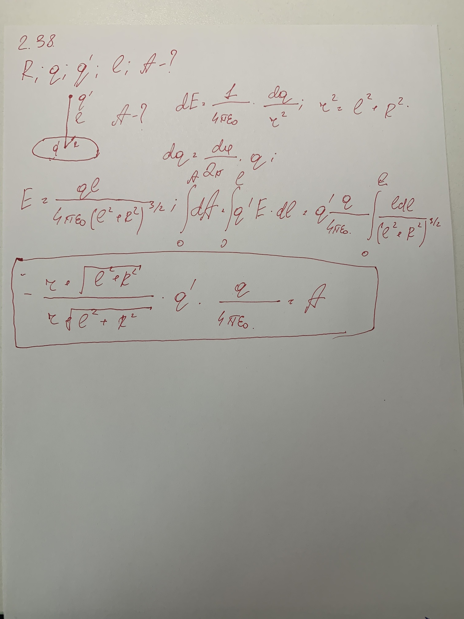Тонкое кольцо радиуса R = 25 см имеет заряд q = 5,0 мкКл, неравномерно распределенный по кольцу. Найти работу электри- ческих сил при перемещении точечного заряда q¢ = 1,0 мкКл из центра кольца по произвольному пути в точку, находящуюся на оси кольца на расстоянии l = 50 см от его центра.