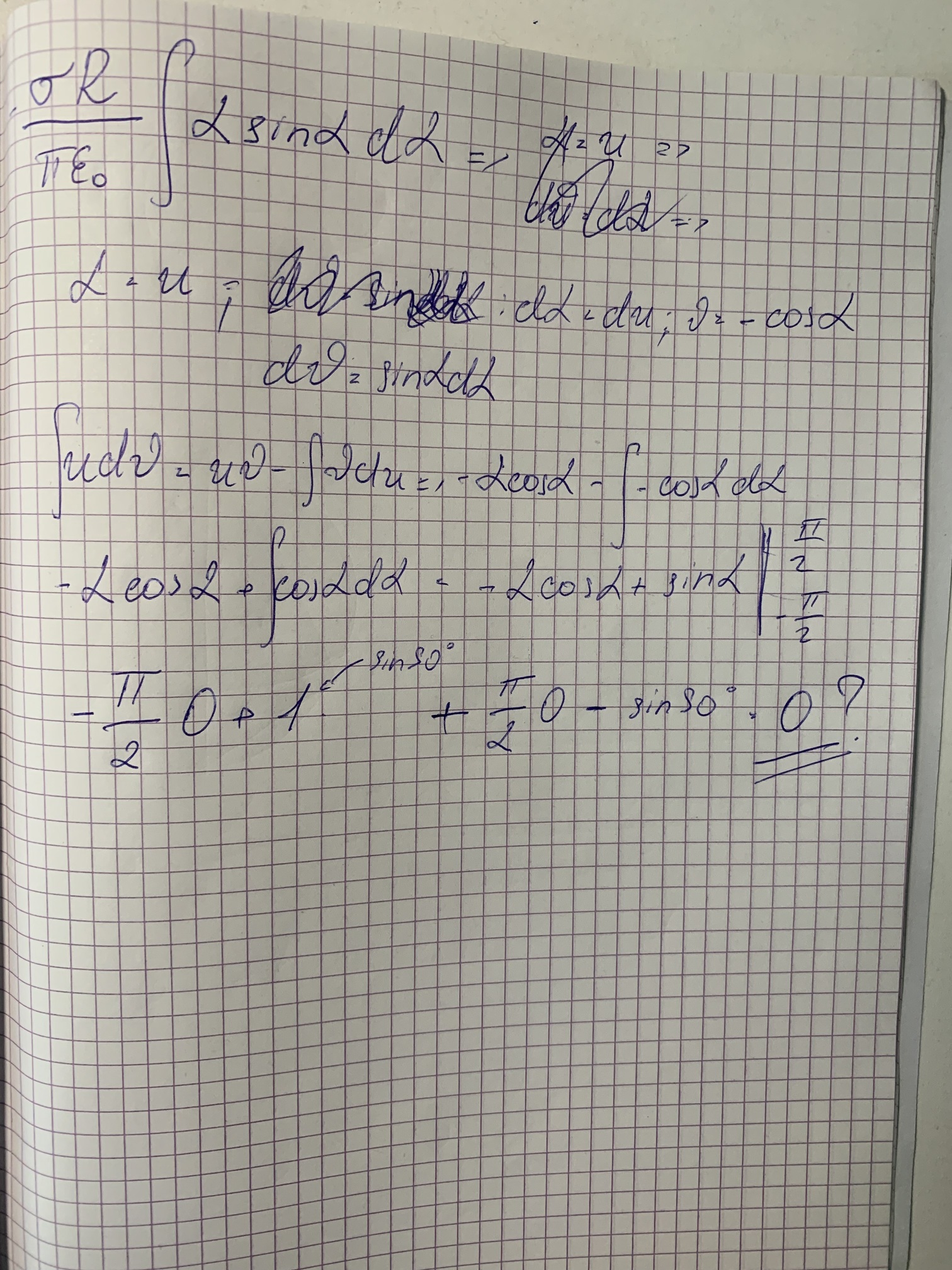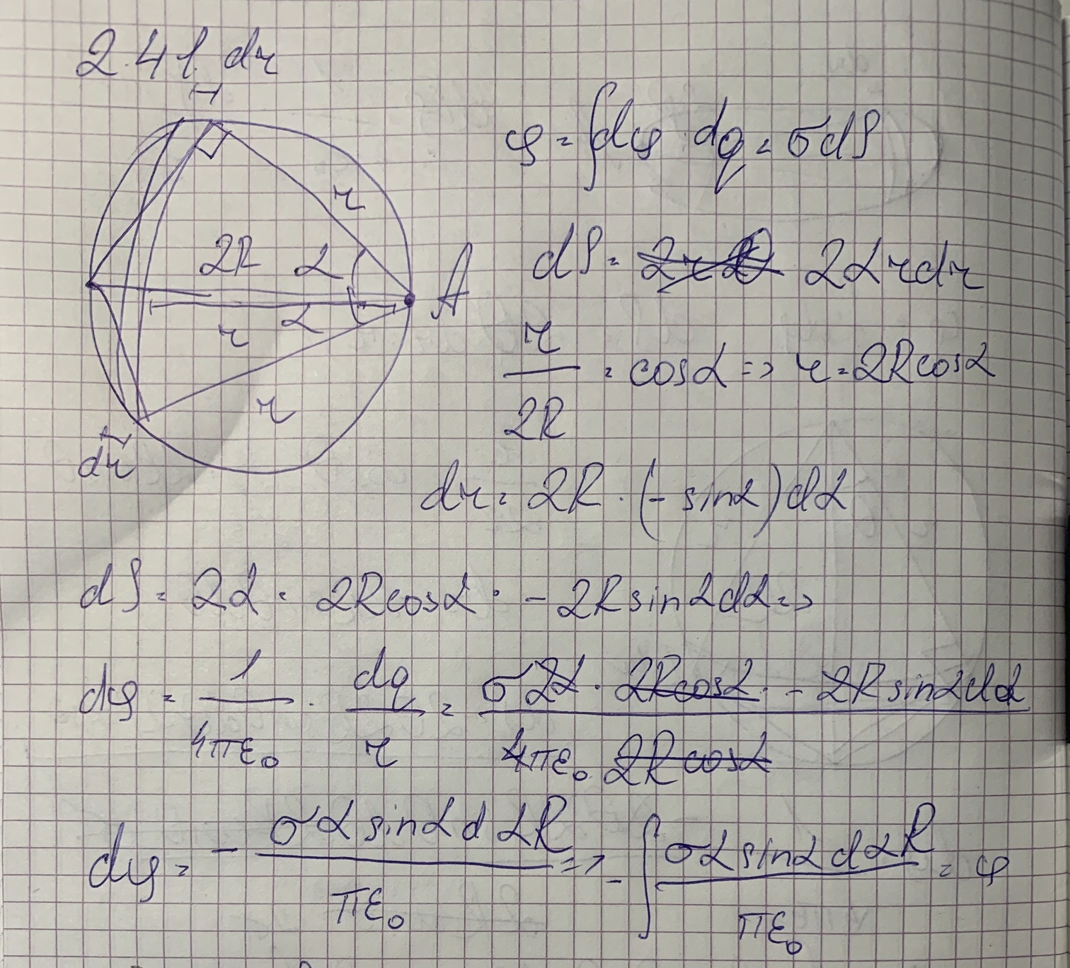 R = 20 см, по которому равномерно распределен заряд с поверхностной плотностью о = 0,25 мкКл/м^2. Можете найти ошибку , почему у меня в конце выходит 0?