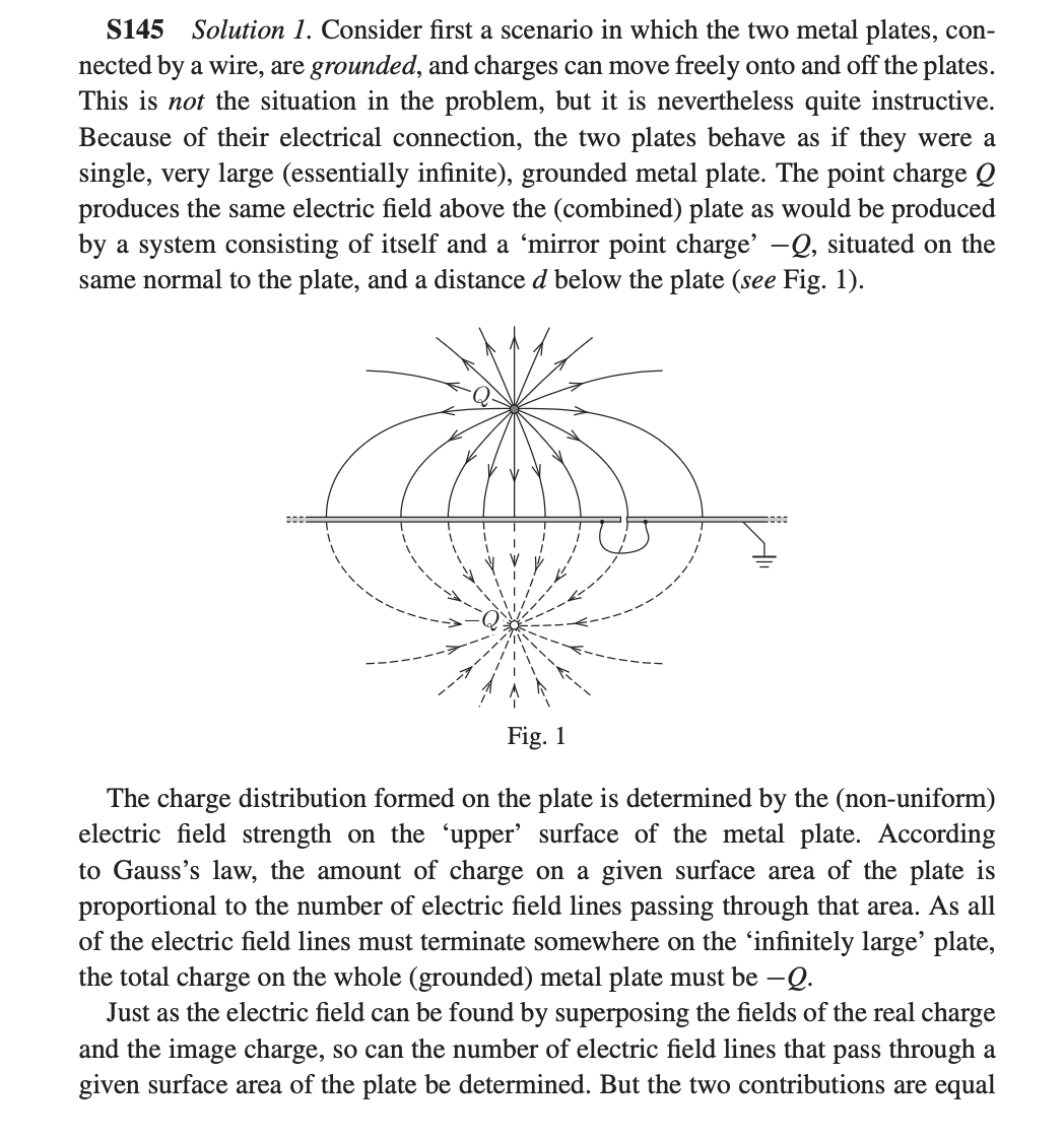 Я так понял, что заземление используется для метода изображений, чтобы потенциал пластины был равен нулю, поэтому «мнимый» заряд будет находиться на другой сторонке симметрично. (Если бы не была заземлена, то потенциал отличался бы от нуля и «мнимый» заряд находился бы в другой точке).