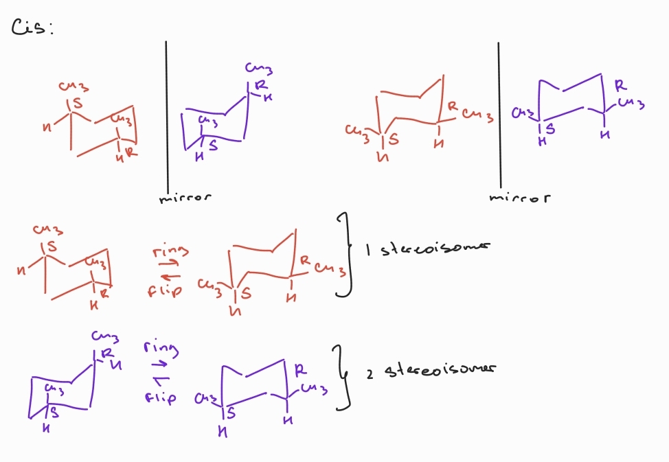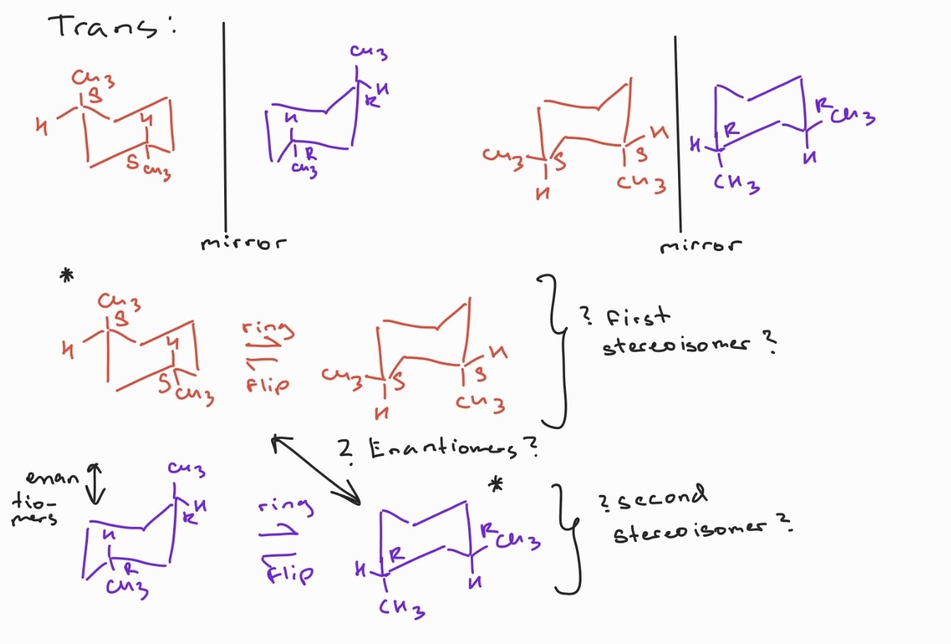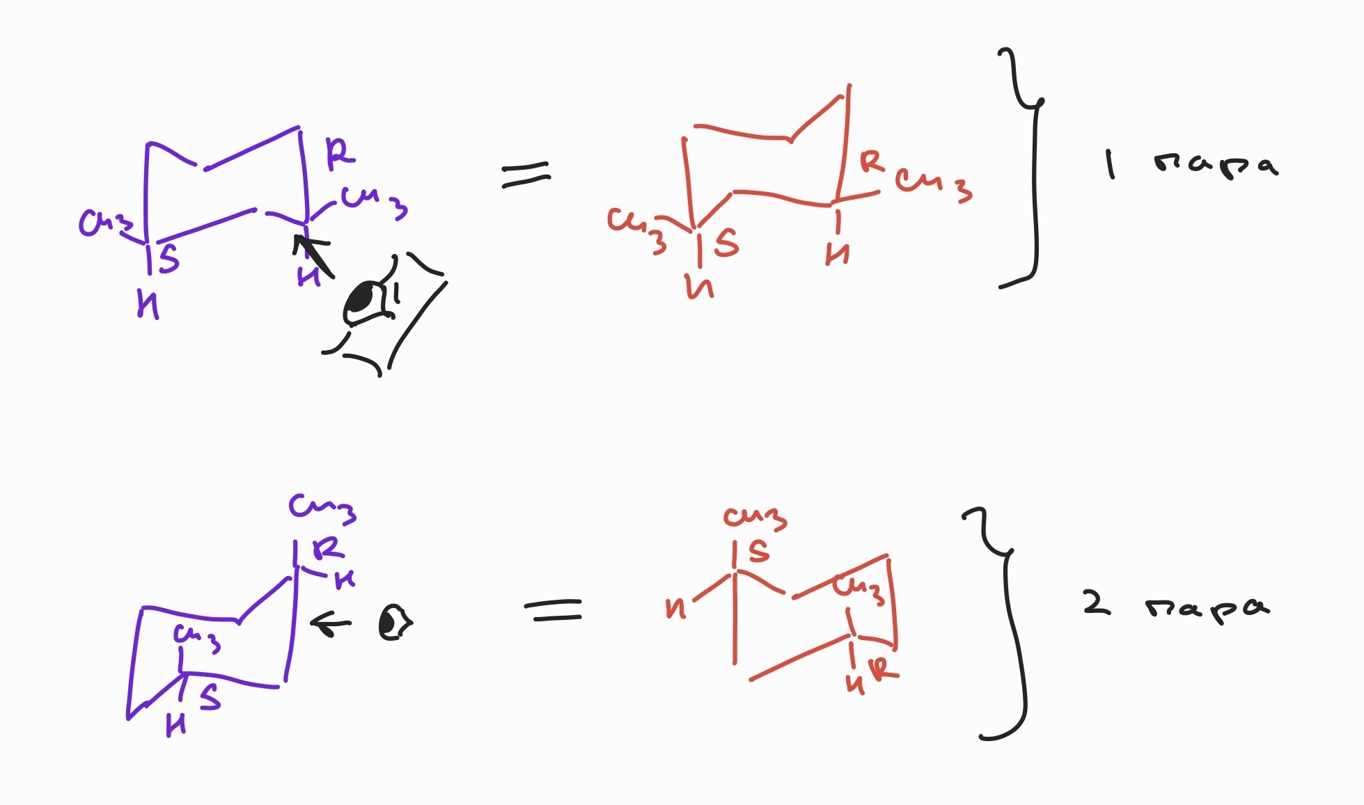 Одна пара(обведенная) это посути одно вещество. Первая пара(вещество) и вторая пара(вещество) связанны между собой через ринг флип,в одном метилки экваториал в другом аксиал (тоесть они конформеры). Это и есть возвращение к изначалному вопросу: