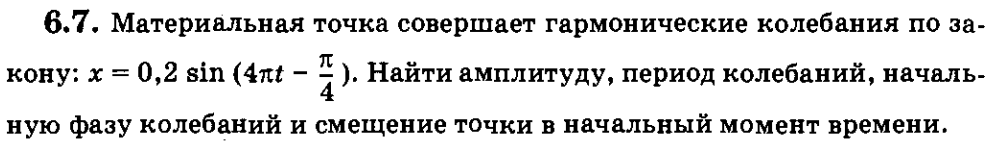 6.7. Материальная точка совершает гармонические колебания по закону: x=0.2sin(4πt-π/4). Найти амплитуду, период колебаний, начальную фазу колебаний и смещение точки в начальный момент времени.