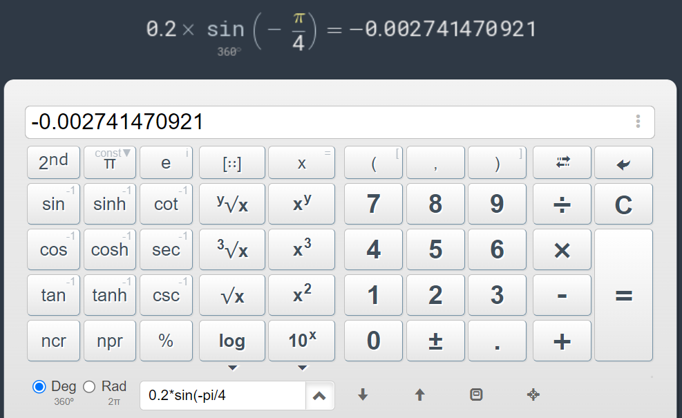 тогда смещение x(0) = 0.2\sin ( -\frac \pi 4) = -\frac {0.2}{ \sqrt 2}