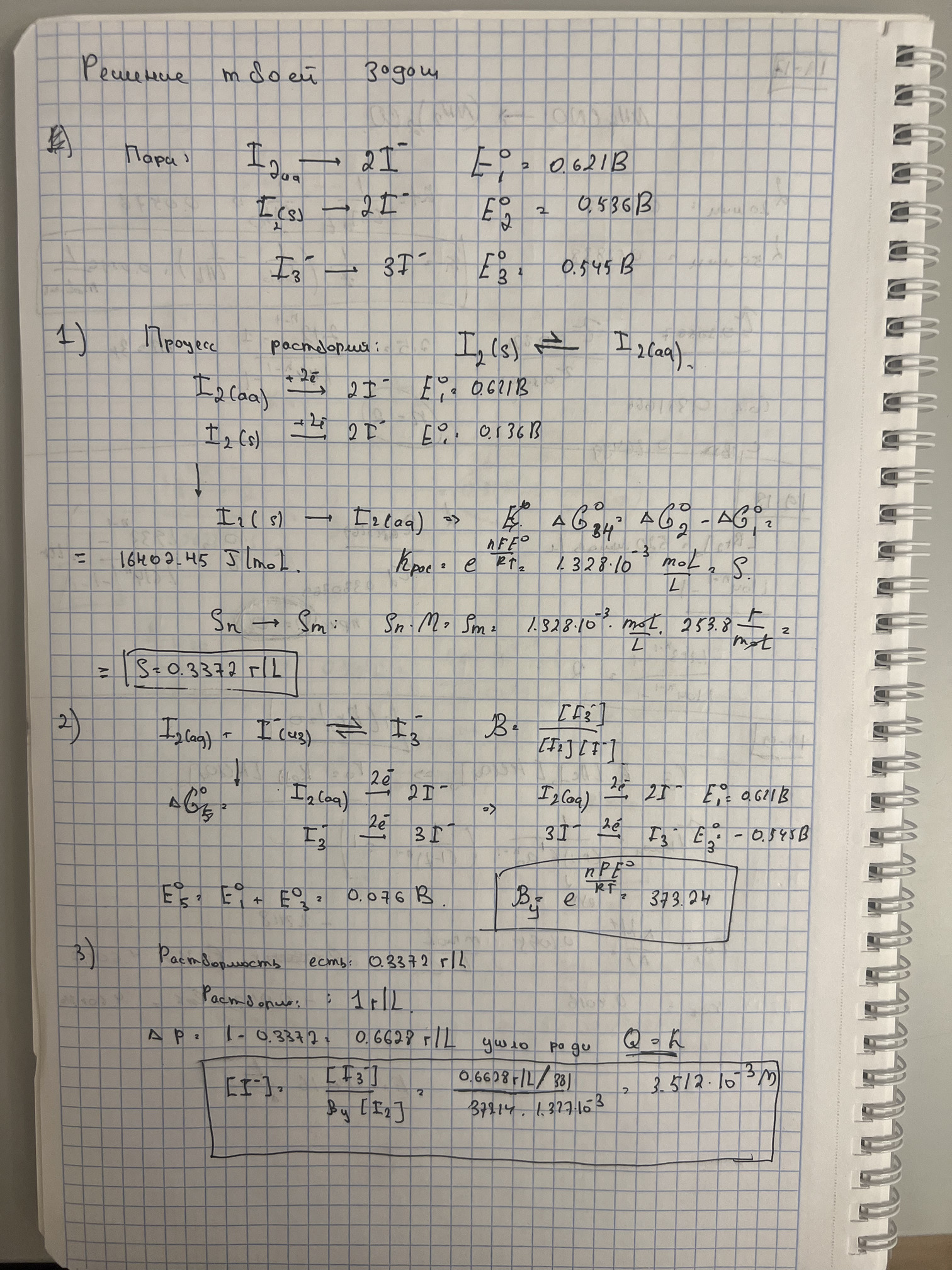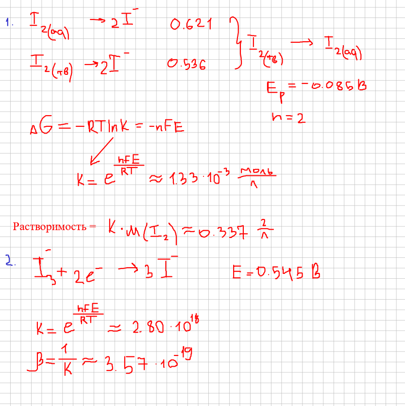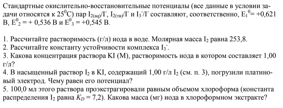 Стандартные окислительно-восстановительные потенциалы (все данные в условии задачи относятся к 250С) пар I2(aq)/I-, I2(тв)/I- и I3-/I- составляют, соответственно, E1 = +0,621B, E2 = + 0,536B и E3 = +0,545 В.