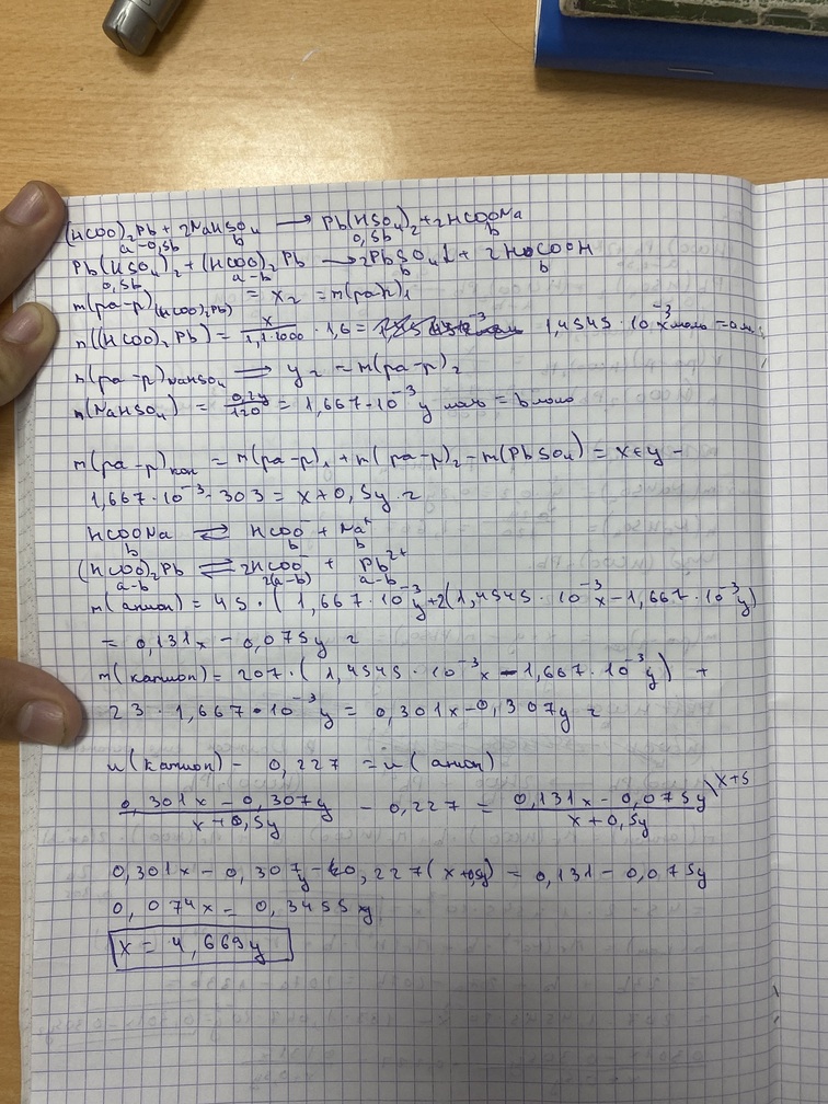 А здесь оказывается не нужно второе уравнение(потому что просить массовая долю). Но у меня моль формата свинца выходит минус. Но если взять что гидросульфат натрий в избытке то масса катионов определено меньше массы анионов.