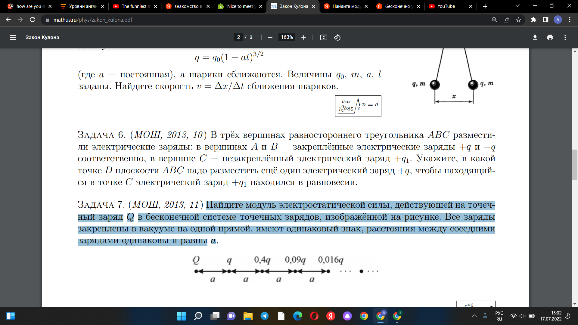 Здесь нужно просуммировать все кулоновские силы, действующие на заряд Q, то есть \displaystyle \sum_{i=1}^n F_{кn}, где n - это \infty (сумма расходящегося ряда). Нам дано расстояние между зарядами и значения зарядов. Сразу можно обратить внимание на, то как изменяются значения зарядов в зависимости от числа по счёту от заряда Q. Решение задачи сводится к нахождению зависимости q (n):