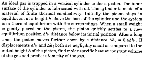 Then we place a small weight, giving an additional pressure mg/S to system (we don’t know the mass but further we can calculate it). Sentence “The piston quickly settles to a new equlubrium position \Delta h_1 distance below its initial position” implies that after reaching \Delta h_1, the system stays in mechanical, though not thermal equlibrium with the surface (well, oscillations of the piston also take place in this process here, but let’s think that the oscillation time is much smaller than specific time for system to cool down). So we use 1st thermodynamic law