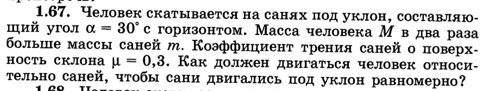 1.67. Человек скатывается на санях под уклон, составляю- щий угол а = 30° с горизонтом. Масса человека М в два раза больше массы саней т. Коэффициент трения саней о поверх- ность склона м = 0,3. Как должен двигаться человек относительно саней, чтобы сани двигались под уклон равномерно?