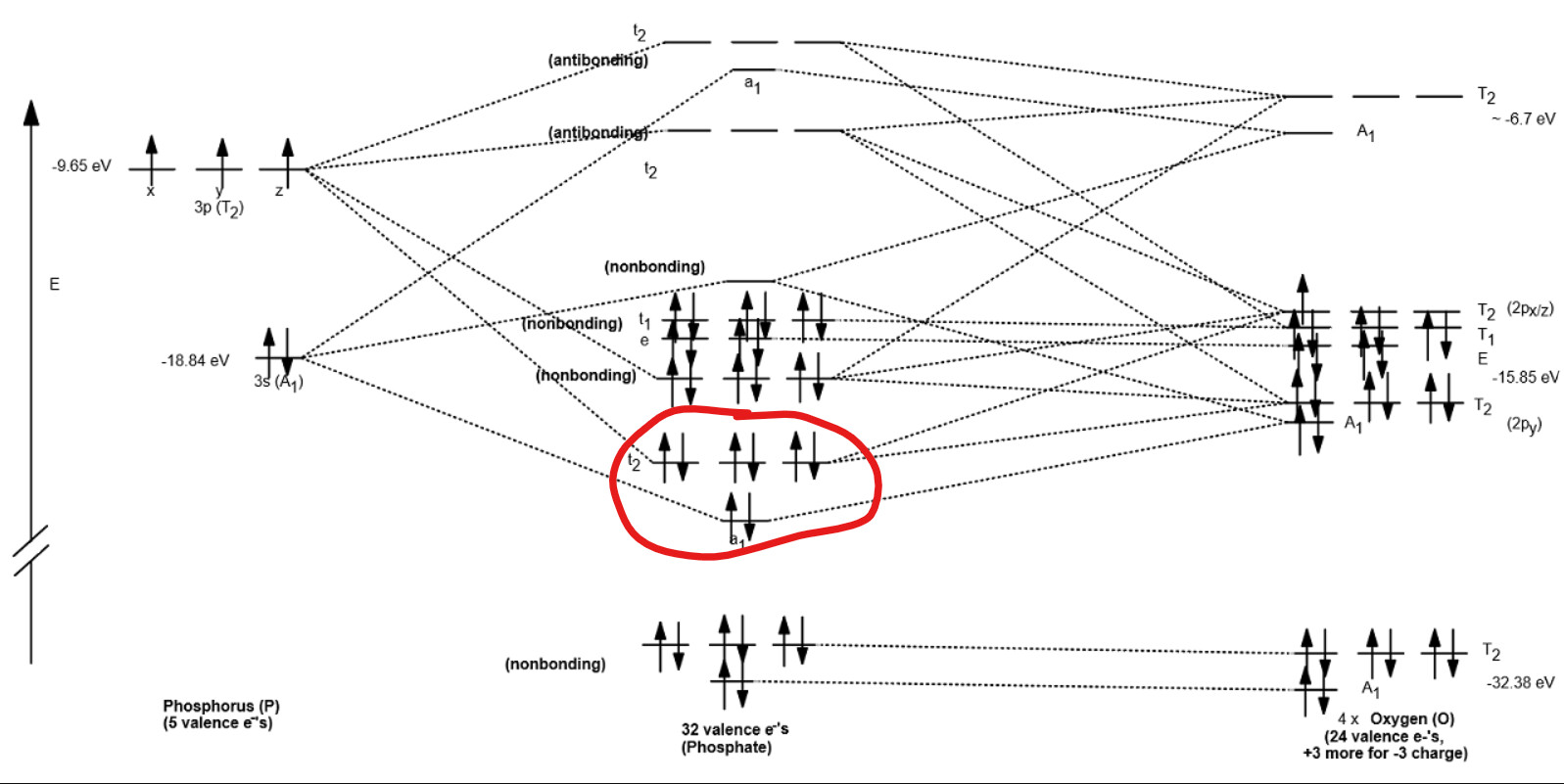 На самом деле фосфор не перекидывает электроны. У него там по диаграмме молекулярных орбиталей 4 связи должны быть (обвел красным на картинке), т.е. запись фосфатов через пять связей, сульфатов через шесть и т.д. это просто атавизм химический, с которым нам придется мириться