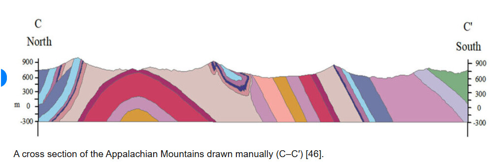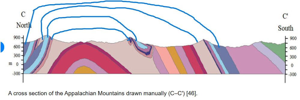 Причина тому что есть такие же линии параллельно тем что справа (можете увидить дорисовку того каким антиклиналь был до эрозии), также высота соответсвует тому что там эрозированный антиклиналь
