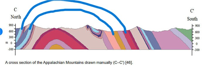 Спс за помощь, скорее всего это антиклиналь эрозированная. Тогда выходит что ее левая часть эрозироввалпсь, т к нет на картинке части подходящей ей по составу(цвету). А как тогда соединяются другие части складок разреза горы, как на картинке снизу?