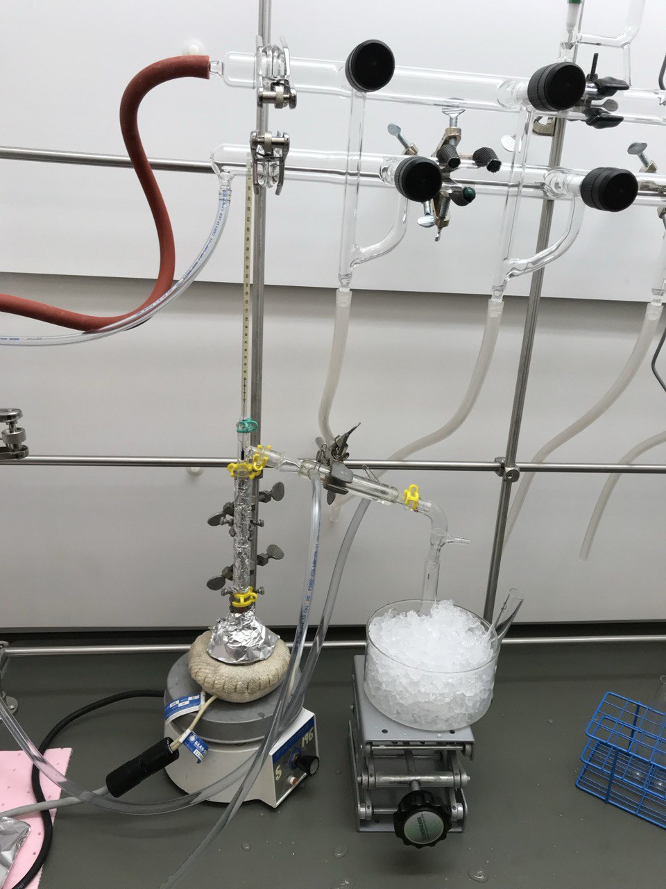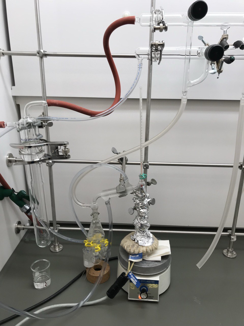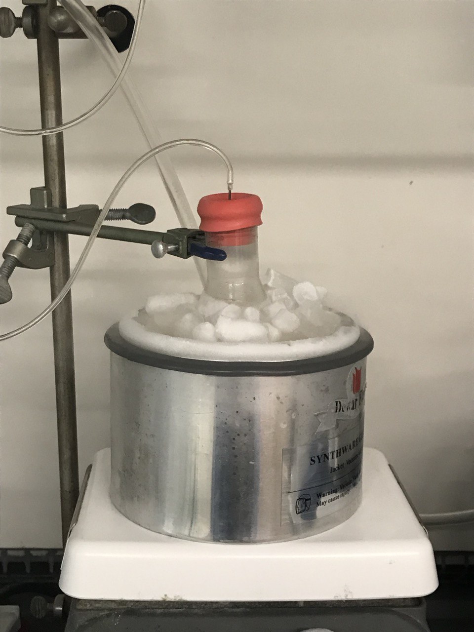Интересное тут то, что реакция проводится под инертной атмосферой! Игла нужна чтобы держать и обновлять Азот. Если бы вы могли посмотреть сверху, то увидели бы, что сосуд закрыт. Удивительно, что все реагенты до этого держались под азотом прежде чем перевести их в сосуд на фото. Для этого мы использовали шприц. Точно, реакция на бумаге выглядит примерно так: