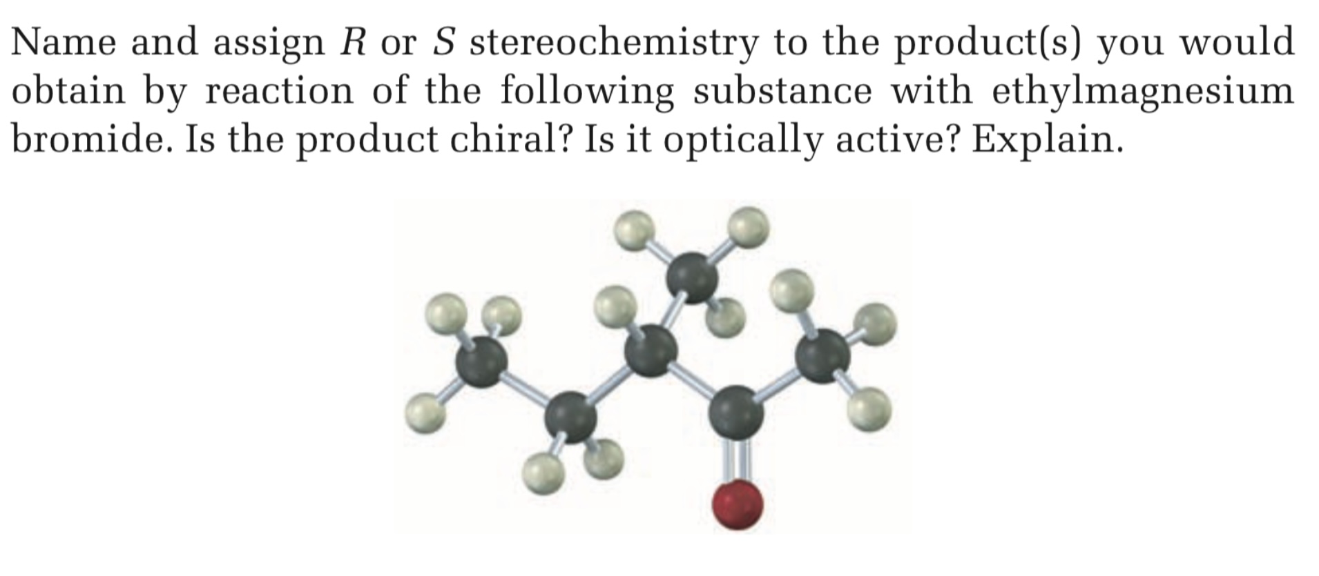 Name and assign R or S stereochemistry to the product(s) you would obtain by reaction of the following substance with ethylmagnesium bromide. Is the product chiral? Is it optically active? Explain.