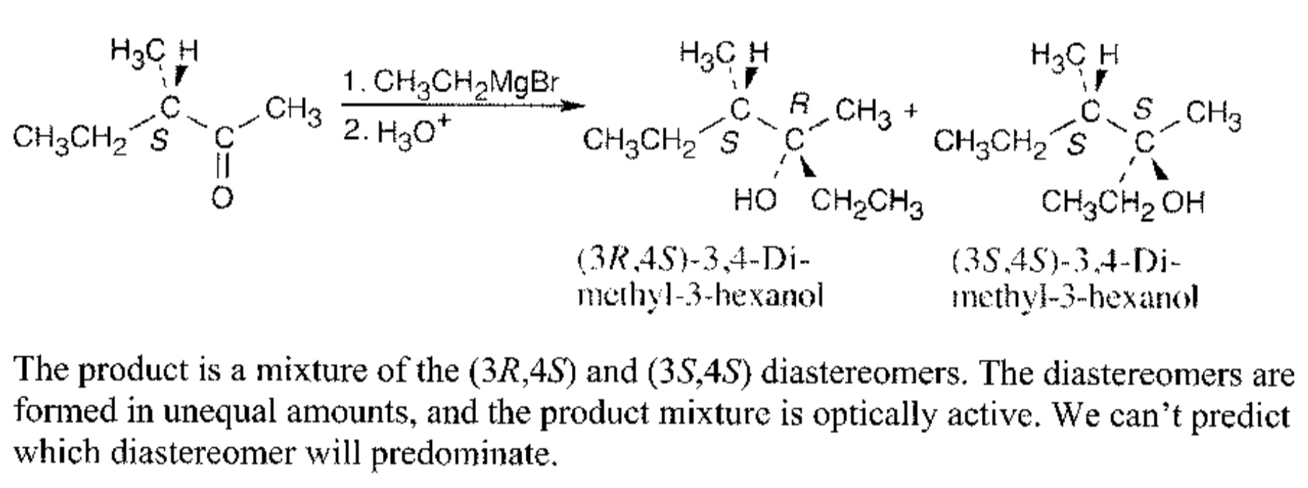 Не совсем понял вашего объяснения, если в краце, то этильной группе напасть со стороны метальной группы хоть капельку, да тяжелее чем напасти со стороны где стоит водород, разве нет? Даже если процентное соотношение диастереомеров будет 51:49, то мы же можем говорить, что (3R,4S) доминирует хоть немного, а значит и предсказать можем.