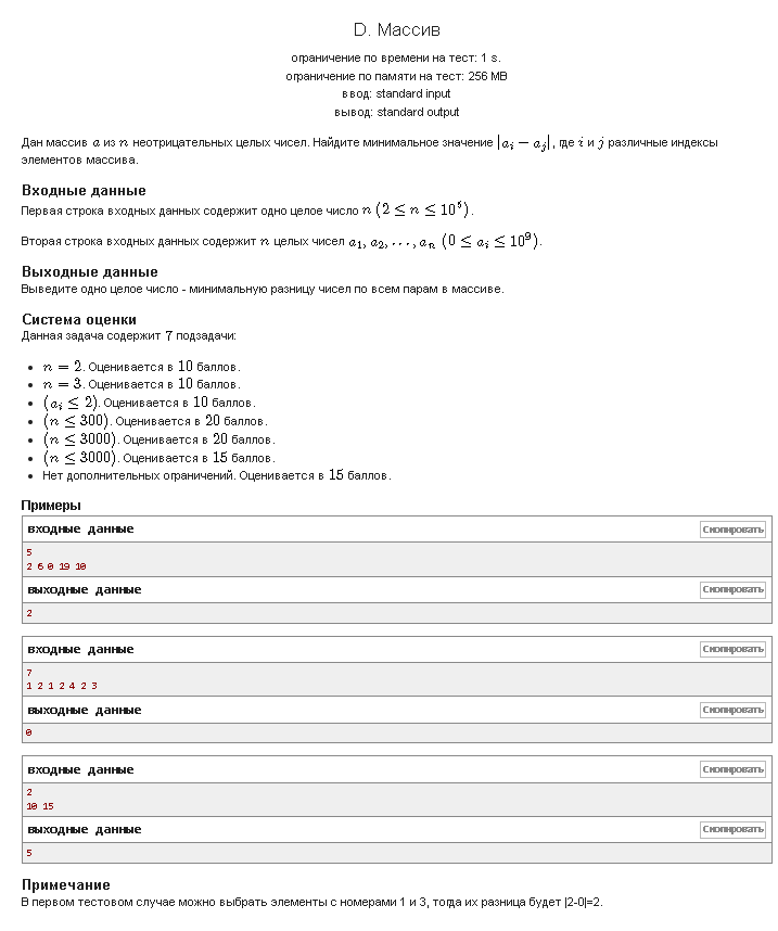 Нужно отсортировать массив и искать минимум среди разниц соседних элементов. Это работает потому что если представить элементы массива как точки на оси X то очевидно будет что ближайшие точки являются соседними.