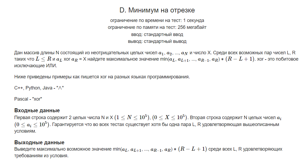 Наше условие корректности отрезка - a[l] ^ a[r] = x, тогда ясно, что перебирая циклом a[j] в левой части (то есть j \in [l[i], i]), нам нужны a[k] = a[j] ^ x в правой части (то есть k \in [i, r[i]]), причем нам нужно максимизировать (r - l + 1), поэтому просто найдем бинпоиском самый правый a[k], который все еще лежит в правой части и обновим ответ значением a[i] * (k - j + 1).