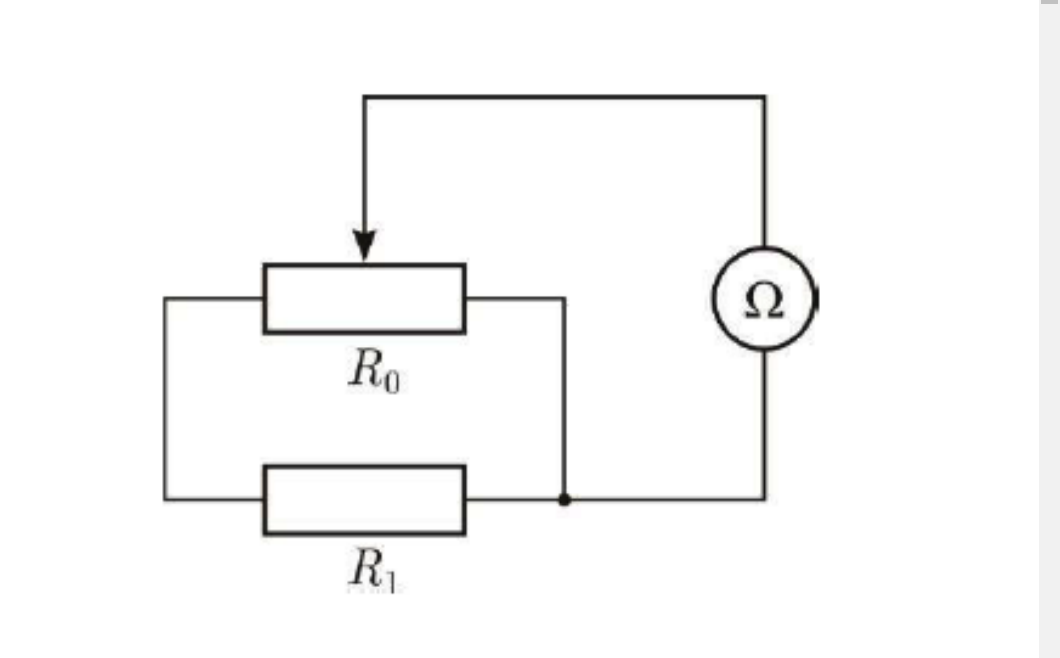 На рисунке изображена схема электрической цепи, состоящей из омметра, резистора и реостата. Сопротивление резистора R1 = 5 Ом, а полное сопротивление реостата равно R0 = 20 Ом. Движок реостата расположен