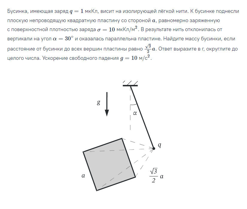 Бусинка, имеющая заряд q=1 мкКл, висит на изолирующей лёгкой нити. К бусинке поднесли плоскую непроводящую квадратную пластину со стороной a, равномерно заряженную с поверхностной плотностью заряда 𝜎=10 мкКл/м2. В результате нить отклонилась от вертикали на угол 𝛼=30∘ и оказалась параллельна пластине. Найдите массу бусинки, если расстояние от бусинки до всех вершин пластины равно √3/2a. Ответ выразите в г, округлите до целого числа. Ускорение свободного падения 𝑔=10 м/с2.