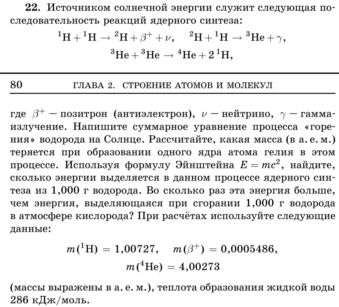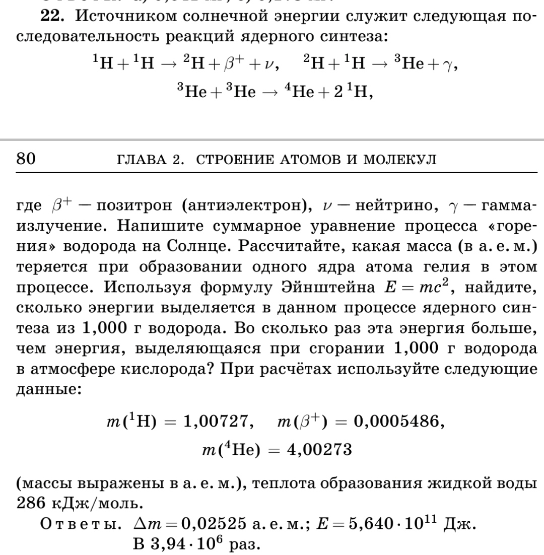 где $\beta^+$ — позитрон (антиэлектрон), $\nu$ — нейтрино, $\gamma$ — гамма-излучение. Напишите суммарное уравнение процесса «горения» водорода на Солнце. Рассчитайте, какая масса (в а.е.м.) теряется при образовании одного ядра атома гелия в этом процессе. Используя формулу Эйнштейна $E = mc^2$, найдите, сколько энергии выделяется в данном процессе ядерного синтеза из 1,000 г водорода. Во сколько раз эта энергия больше, чем энергия, выделяющаяся при сгорании 1,000 г водорода в атмосфере кислорода? При расчетах используйте следующие данные: