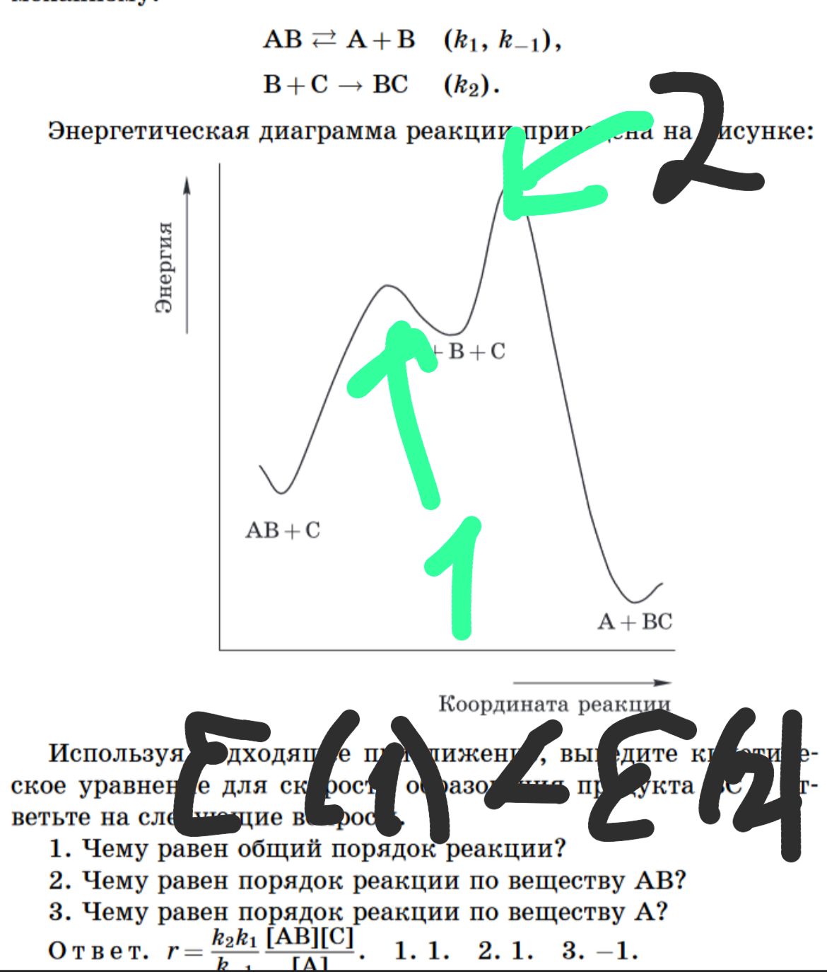 Я говорю о том что по графику энергия активации для первой реакции больше чем энергия активации для второй реакции из чего следует что вторая реакция будет быстрее. Так как реакции последовательные, лимитирующей будет самая медленная, то есть первая. Но если посмотреть на ответ и попробовать подогнать, то видно что они считают вторую реакцию лимитирующей.