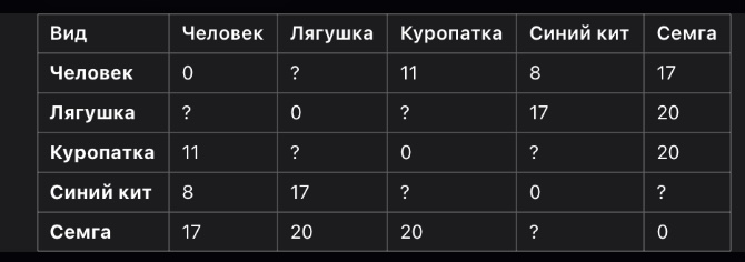 Филогенетическое дерево показывает историю процесса дивергенций видов от общих предков. Представим, что вы сравниваете первые 30 аминокислот альфа субъединицы гемоглобина 5 разных видов. Различия в аминокислотных остатках показаны в таблице ниже. (4 б)