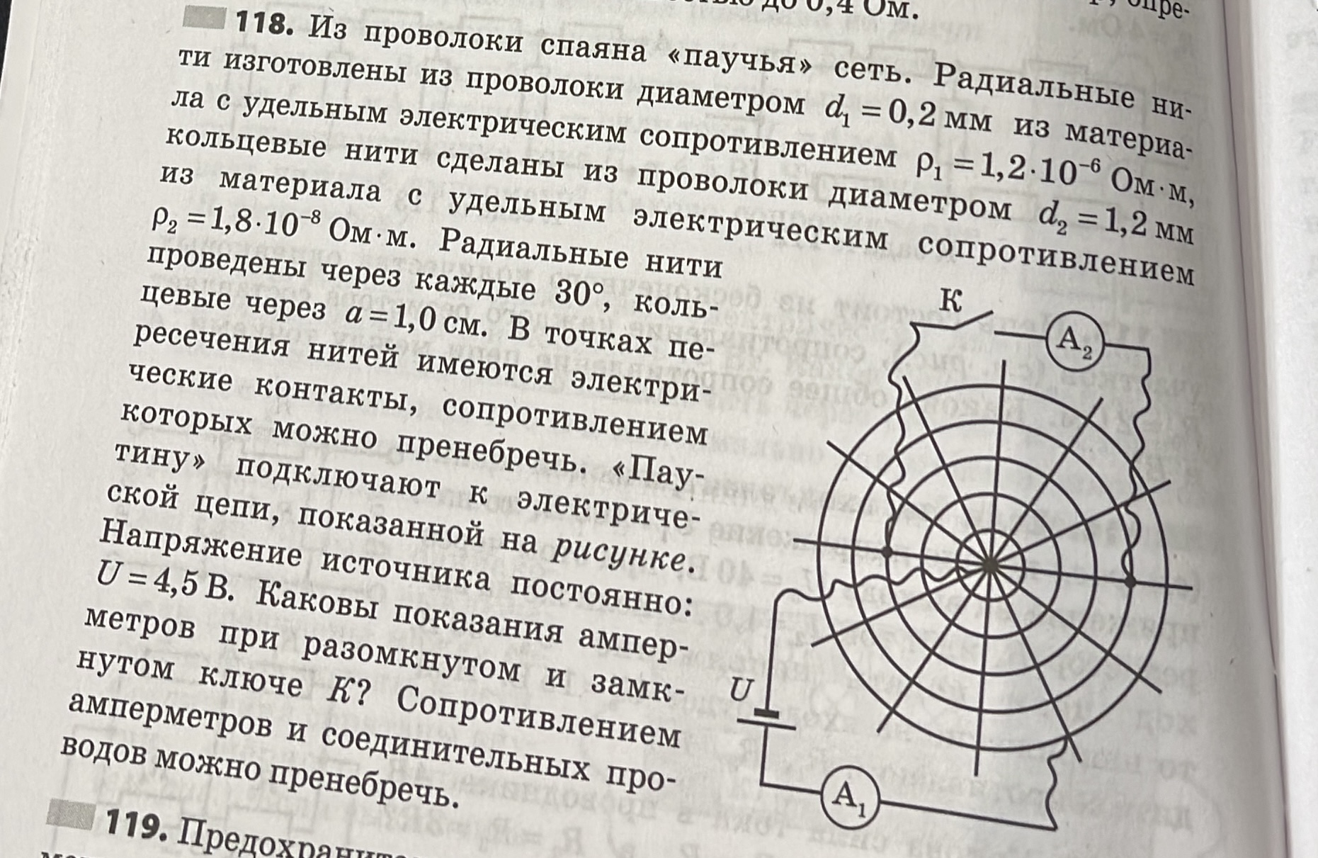 118. Из проводки спаяна “паучья” сеть. Радиальные нити изготовлены из проволки диаметром d_1 = 0,2 мм из материала с удельным электрическим сопротивлением \rho_1=1,2 \cdot 10^{-6} Ом * м, кольцевые нити сделаны из проволки диаметром d_2 = 1,2 мм из материала с удельным электрическим сопротивлением \rho_2 = 1,8 \cdot 10^{-8} Ом*м.