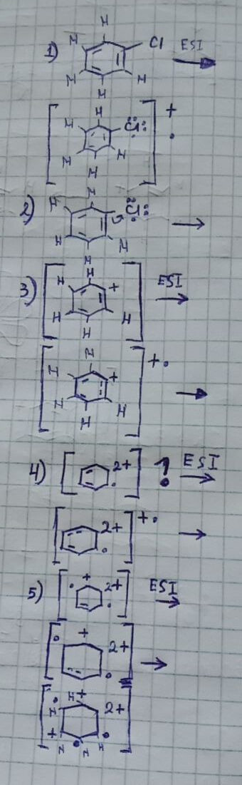 Добрый день! Вот правильно ли я написал некоторые шаги фрагментаций хлорбензола? Ну там может быть такое, что на 3 шагу вместо 2+ и радикала может быть + и + \cdot. Хотел еще дальше фрагментировать, но мне кажется, что у меня что-то неправильно