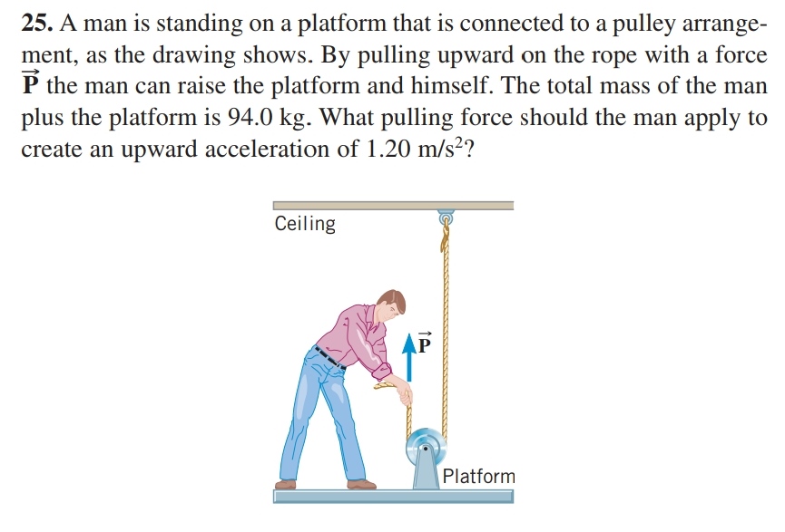 Эта задача была подробно истолкована в механике Морина, 50 стр. “Example: Platfrom and Pulley”