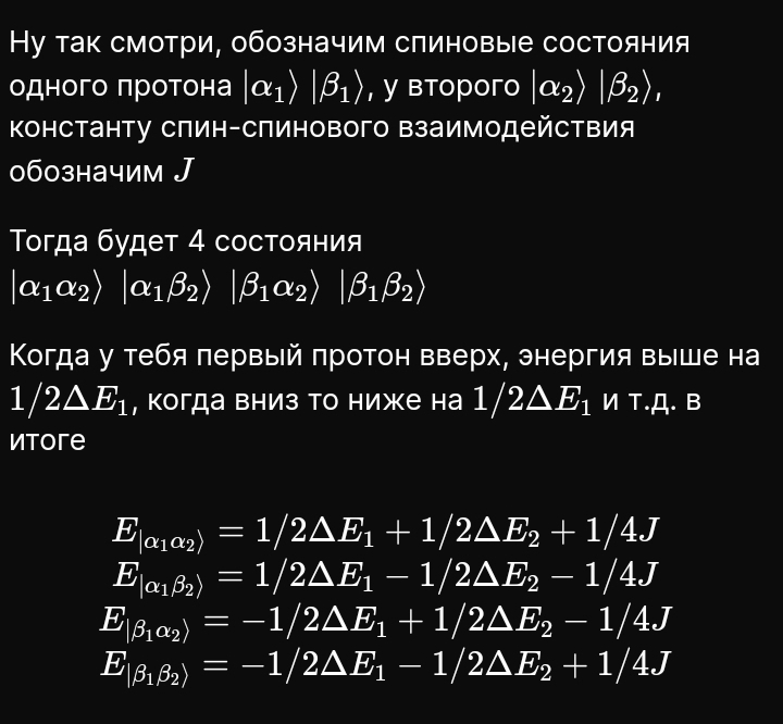 Я о том, почему спины эквивалентных протонов взаимодействуют, но мы при этом не видим дуплетов в спектре т.е. к твоему третьему вопросу.
