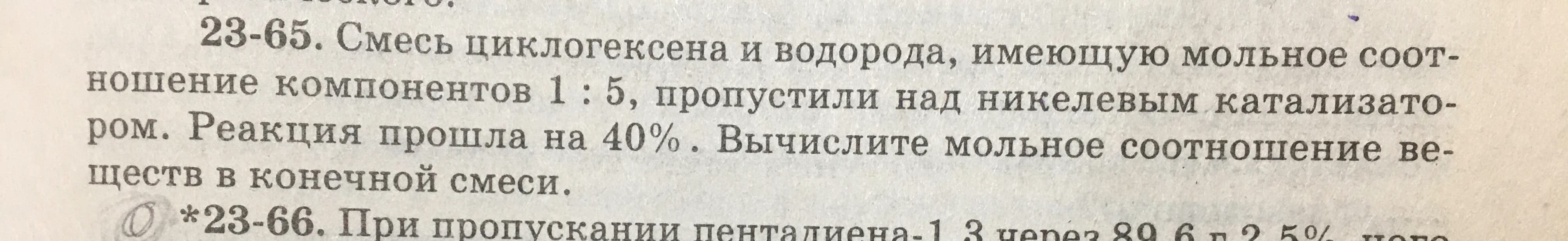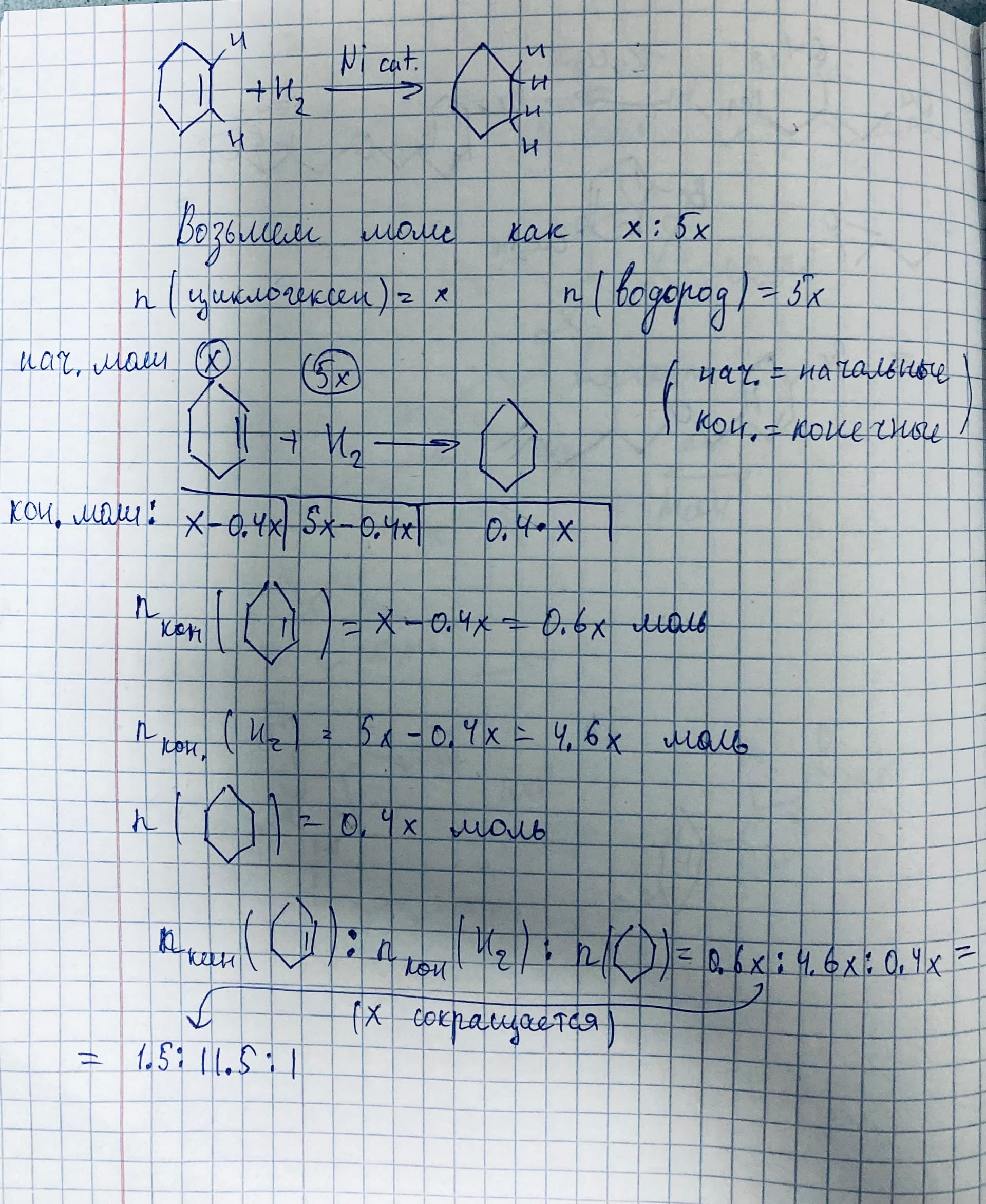 - Взять произвольное количество смеси. Например, 6 молей ( можешь взять хоть 34 или любой другое число, но лучше брать такое, чтобы было удобно ввести расчеты) Тогда у нас будет 1 моль циклогексена и 5 молей водорода