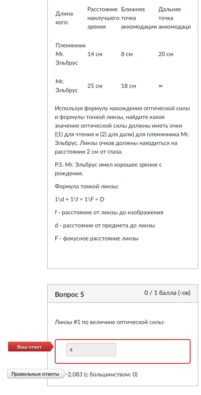 Для того, чтобы сделать специальные очки для своего племянника с близорукостью, Мг. Эльбрус должен был узнать какую оптическую силу должны иметь очки. Для этого он измерил расстояние наилучшего зрения, длину дальней точки и ближней точки аккомодации своего племянника и себя: