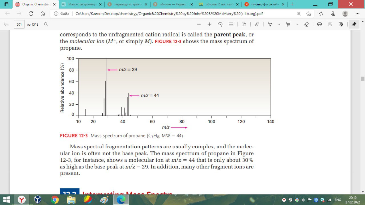 Это не совсем содержание пропана и они не имели ввиду это. В масс-спектр кладется сам пропан, то есть кроме него там ничего нет. После ионизации молекулы пропана ломаются и попадают в детектор. То, что они хотели сказать — даже если ты исследуешь пропан, это не значит, что в детектор больше всего будет попадать ион пропана. В этом примере больше всего попадал ион со значением m/z = 29. Пик с наибольшей интенсивностью называется base peak. Поскольку он самый большой, мы решили взять его как 100% и интенсивности остальных пиков выражать относительно этого пика в процентах. То есть, 30% интенсивность пика с ионом пропана означает, что количество ионов пропана, которые попали в детектор, составляет 30% от количества ионов с m/z = 29. Само значение они взяли просто посмотрев на значение по y-оси.
