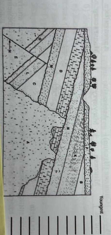 Ну ответ вообще такой: F - B - K - N - A - J -D- M - H - C - L - G - E, чтобы определить какой слой старше или же младше, Вам нужно, в первую очередь взглянуть на рисунок, после этого посмотреть какие слои находятся близко к поверхности, а какие наоборот залегают ниже остальных слоев, как Вы уже предположили нижние слои по своему возрасту являются более древними, а верхние наоборот были сформированы позже. К тому же стоит обратить внимание на некую интрузию, которая располагается между несколькими слоями, в данном случае нужно понимать, что интрузия(A) не может образоваться раньше, чем слои J, D, M. В целом решение такого рода задач не является сложной вещью, но просто нужно брать в расчет, что возраст слоев сверху вниз увеличивается и учитывать в этом порядке интрузии. Ответ может показаться сумбурным, но надеюсь, что смог ответить на ваши вопросы. Если Вы не получили удовлетворительного ответа, готов помочь Вам в поисках ответов на Ваши вопросы.