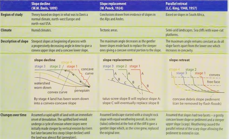 “Ни одна из теорий развития склонов не может быть универсально принятой, хотя каждая из них может иметь местную значимость в контексте климата и геологии (структуры) конкретной территории. В то же время два разных климата или процесса могут привести к одному и тому же типу склона, например, отступлению скал из-за воздействия моря во влажном климате или выветривания в полузасушливом климате.”