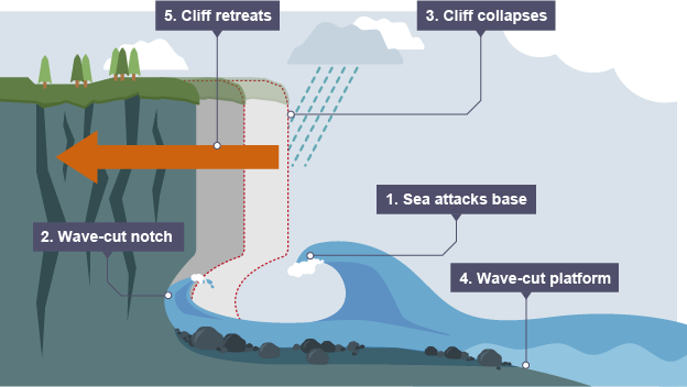Parallel retreat обычно является результатом волновой деятельности, которая разрушает скалы равномерно. Полуаридный климат способствует тому что влияние рек и других факторов помимо физического выветривания и волн минимально