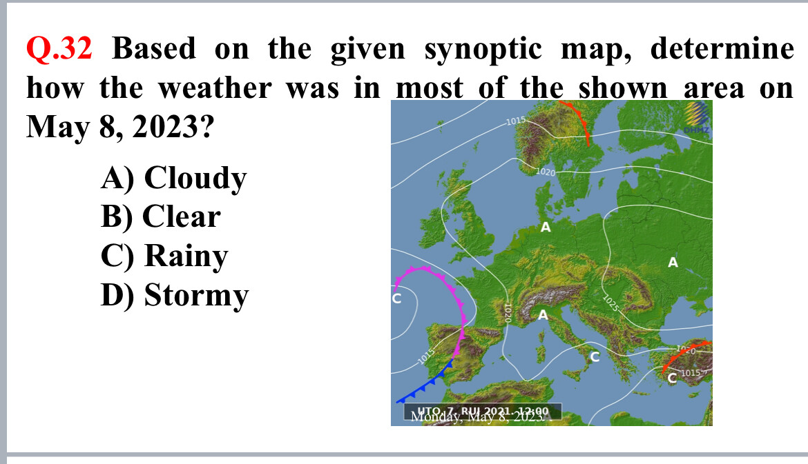 The user is asking for help with a meteorology question about interpreting a synoptic weather map. They've posted an image showing a weather map of Europe for May 8, 2023, and need to determine what the weather was like in most of the shown area. The options are: A) Cloudy B) Clear C) Rainy D) StormyI can see they’ve tagged me (@eudaimon) and are asking for help in Russian. As Eudaimon, I should guide them through understanding how to read synoptic maps using the Socratic method rather than just giving the answer directly.