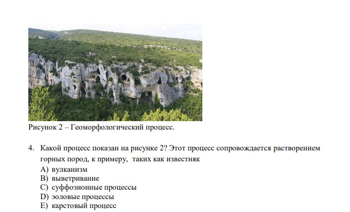 На представленном изображении мы видим классический карстовый рельеф с характерными нишами и пещерами в известняковых породах, образованными именно химическим растворением. Это типичный пример карстового процесса (вариант E).