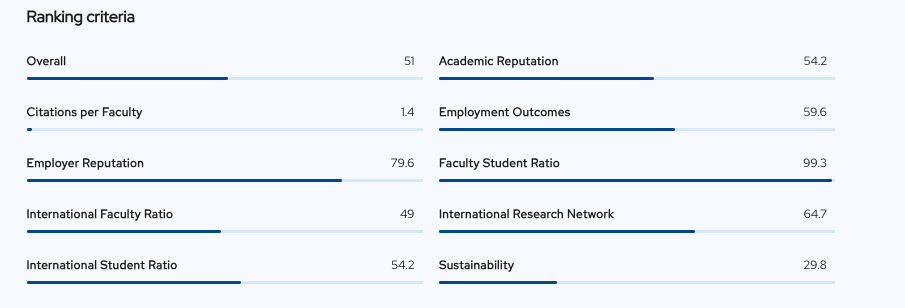 - Citations per Faculty (20%): This metric assesses research impact by measuring the average number of citations received per faculty member.