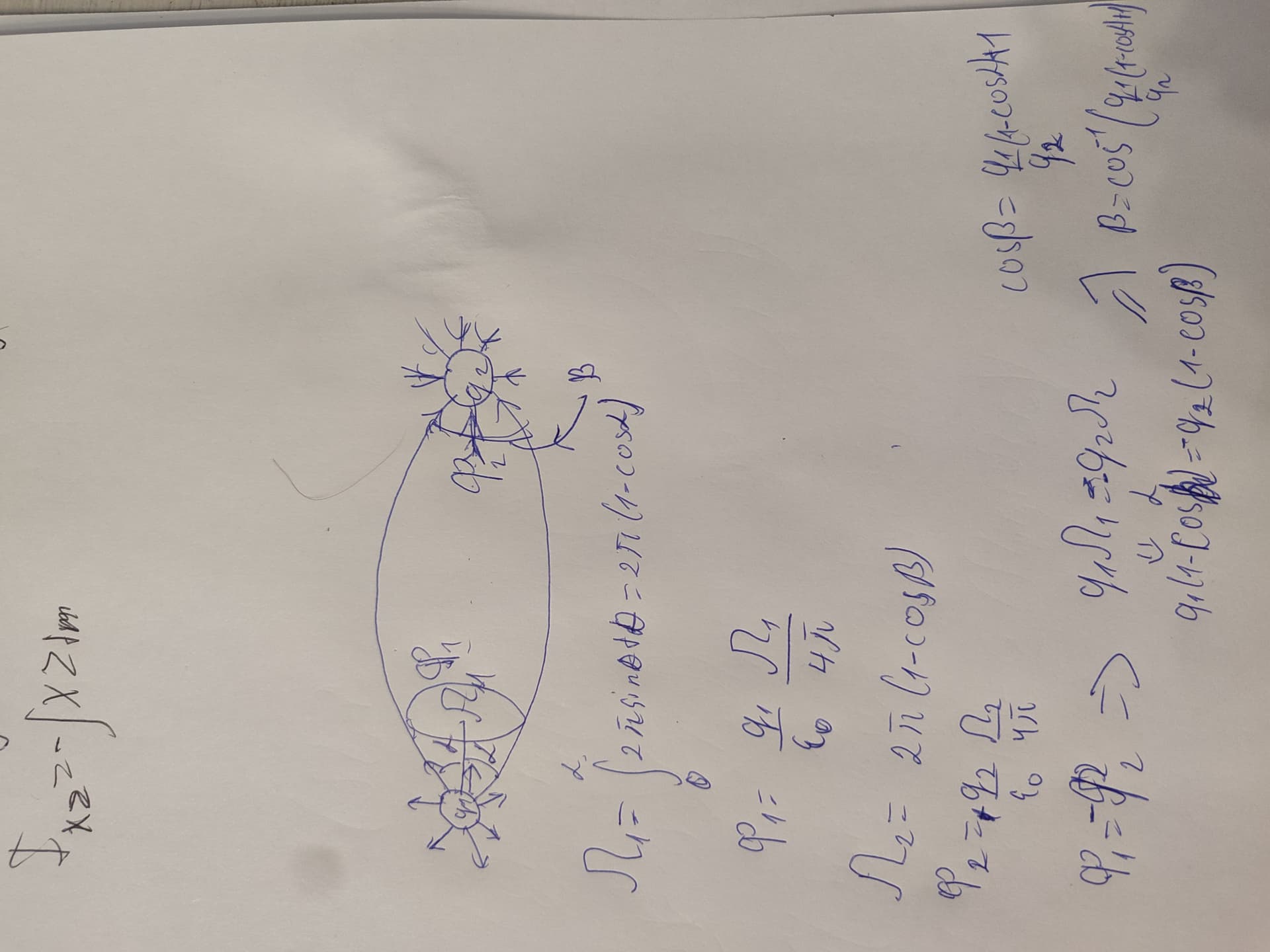 попробуй воспользоваться потоками, поток который выходит из частицы 1 войдет в частицу два, также можешь считать что бесконечно близко к частицам поля входят равномерно со всех сторон.