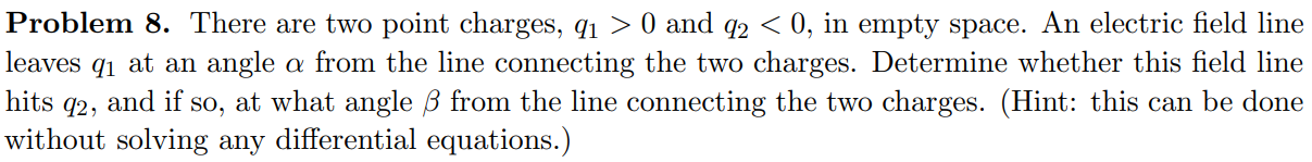 leaves q1 at an angle α from the line connecting the two charges. Determine whether this field line hits q2, and if so, at what angle β from the line connecting the two charges. (Hint: this can be done without solving any differential equations.)