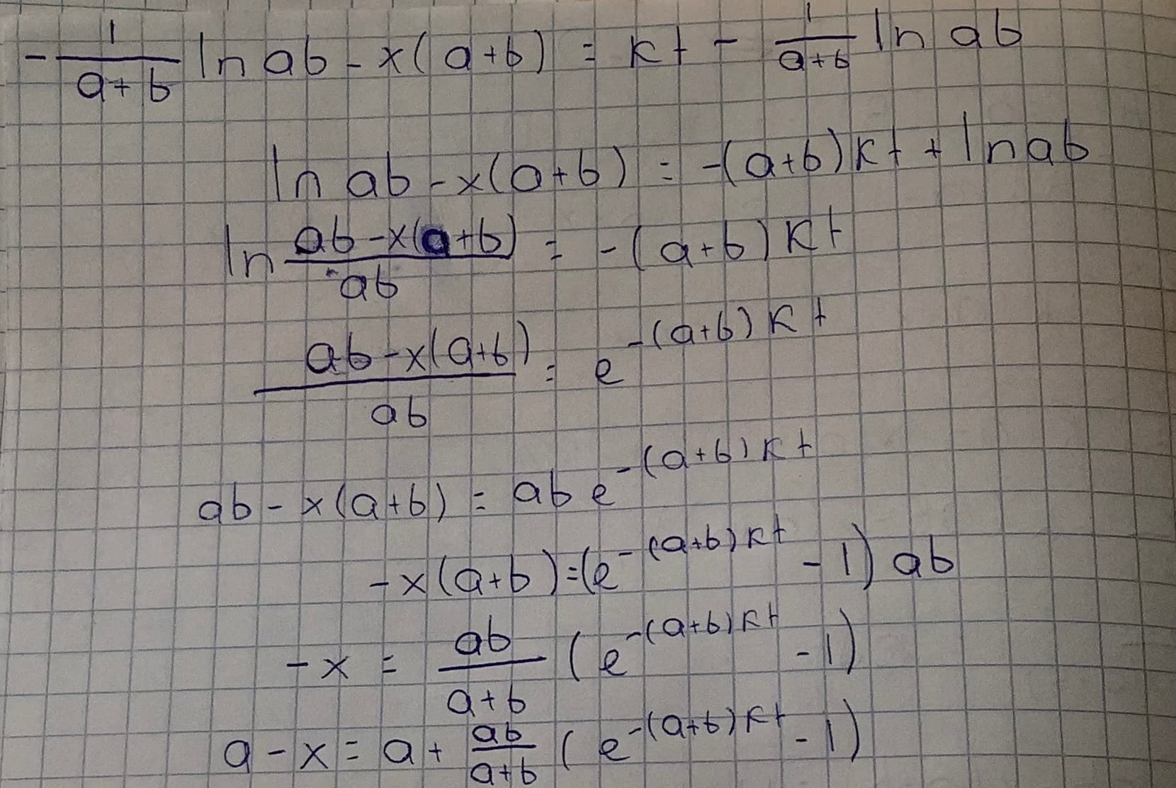 a-x =\frac{a^{2}+ab}{a+b} + \frac{abe^{-k}}{a+b} - \frac{ab}{a+b}