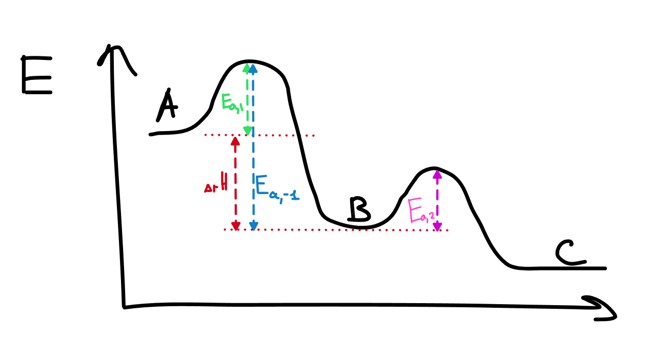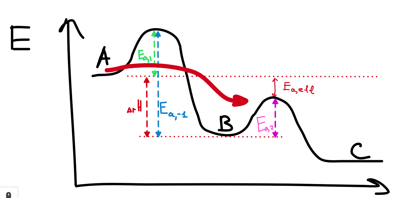 По итогу как таковой отрицательной энергией активаций нет, есть только отрицательная эффективная энергия активаций, которая описывается с помощью энергий активаций отдельных стадий, и эту эффективную энергию активаций мы не можем увидеть как таковой на графике, лишь можем судить с помощью неё как изменится скорость реакций с изменением температуры?