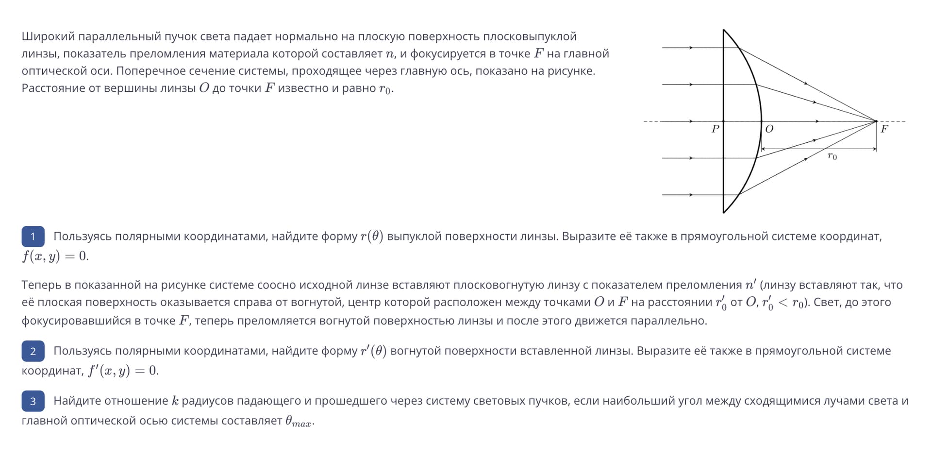 В первом пункте задачи нас просят найти форму выпуклой поверхности линзы r(θ). Для этого нам нужно использовать тот факт, что все лучи собираются в одной точке F. Это ключевое условие.
