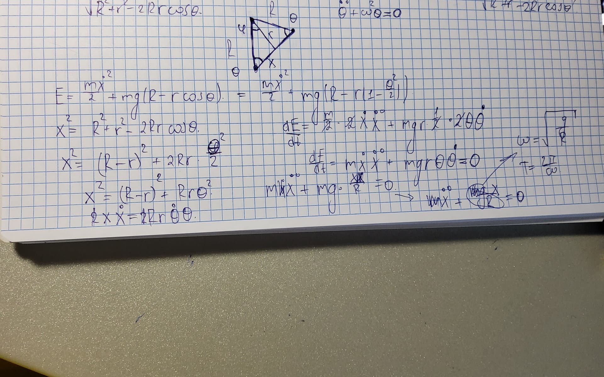 Извините что так поздно.Я пришел к более правильной записи колебаний,продеффиринцировав энергию, но к сожалению у меня выходит ответ как если бы тело двигалось по дуге,а в ответе так другое.