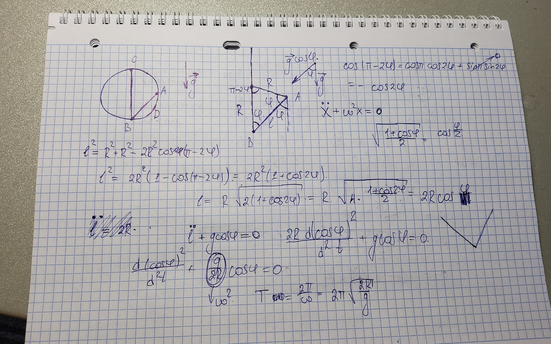 Видно что ты не понял задачу. Ты взял длину хорды AB как длину нити маятника, хотя по условию задачи AB это траектория движения материальной точки. Здесь длина нити маятника это CB