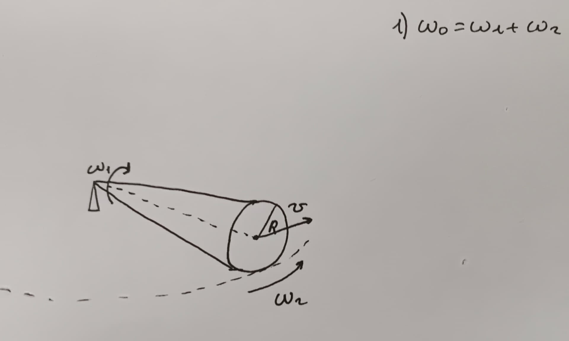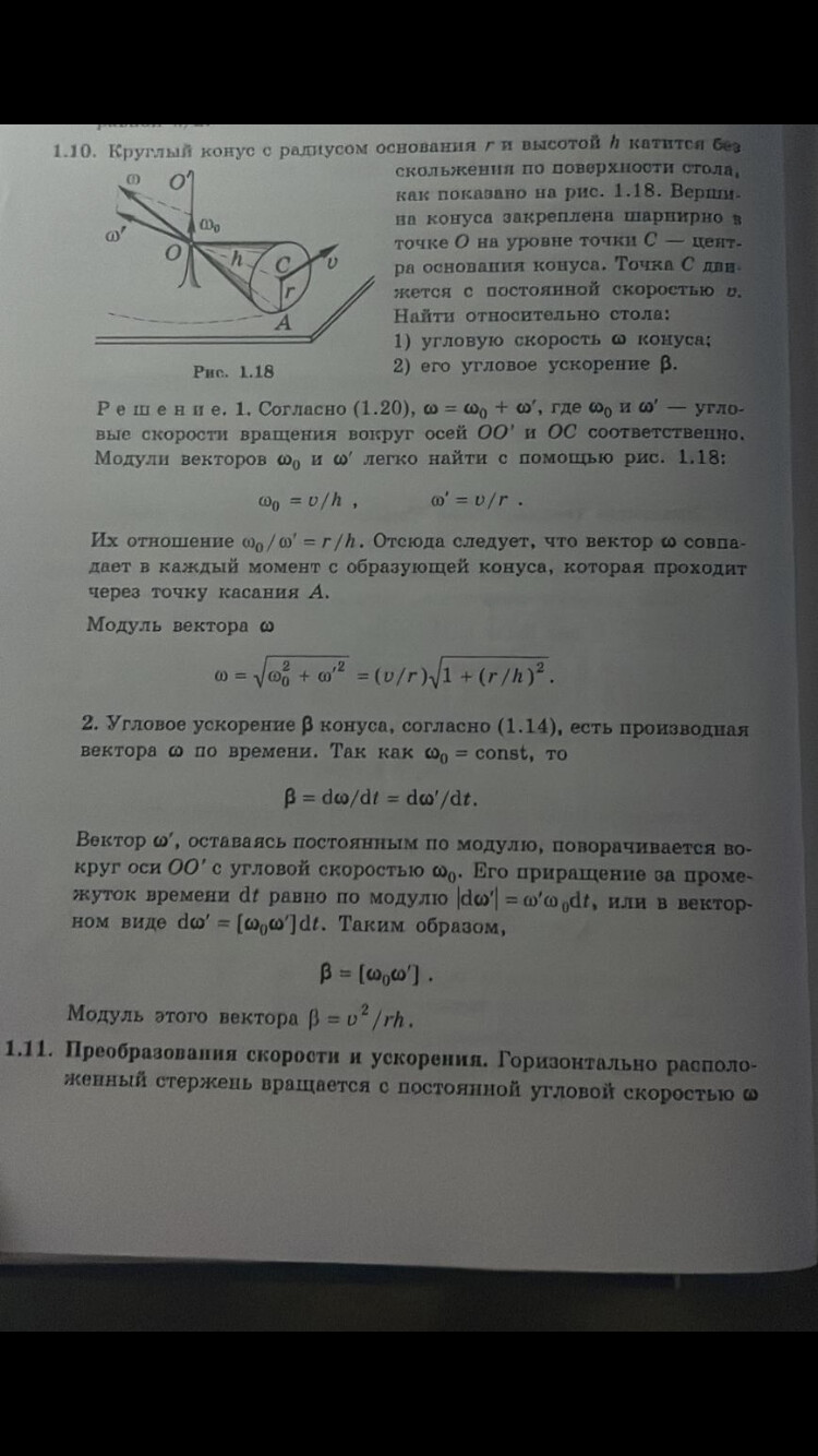 точкой С центром основания конуса. Скорость точки С равна V = 10cM / c Найдите модули угловой скорости и углового ускорения конуса