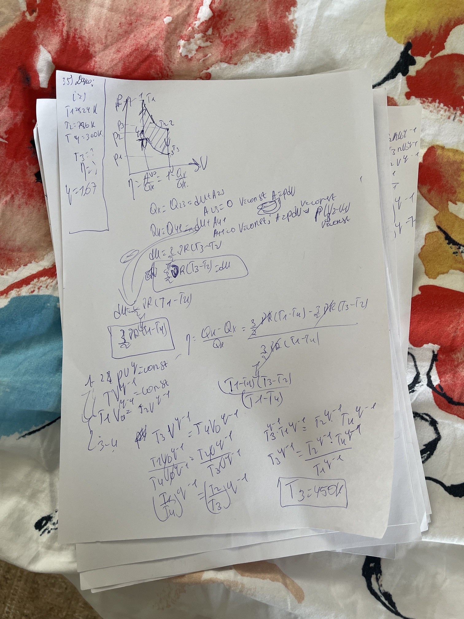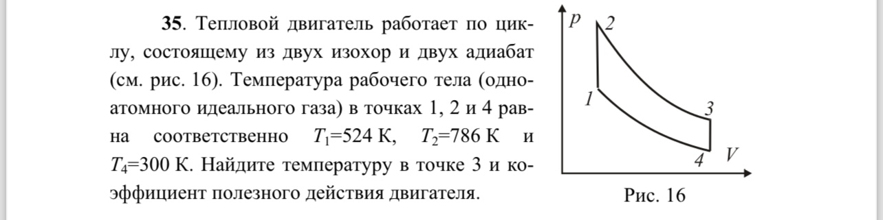 35. Тепловой двигатель работает по циклу, состоящему из двух изохор и двух адиабат (см. рис. 16). Температура рабочего тела (одноатомного идеального газа) в точках 1, 2, и 4 равна соответсвенно T_1 = 524 \ K , T_2 = 786\ K и T_4 = 300 \ K . Найдите температуру в точке 3 и коэффициент полезного действия двигателя.